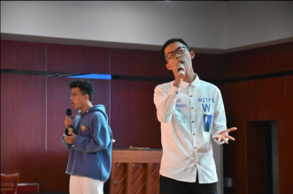 在等待统分结果的过程中,文艺部部长唐果、副部长吕金峰为我们带来了表演——《情非得已》、《光辉岁月》,流畅的吉他弹奏与演唱向在场观众展现了文艺部同学们的风采。