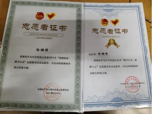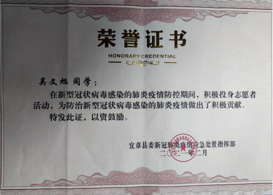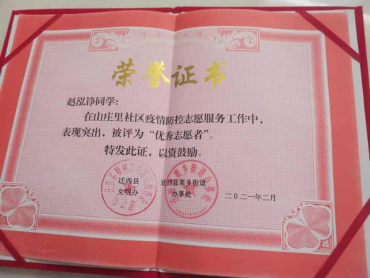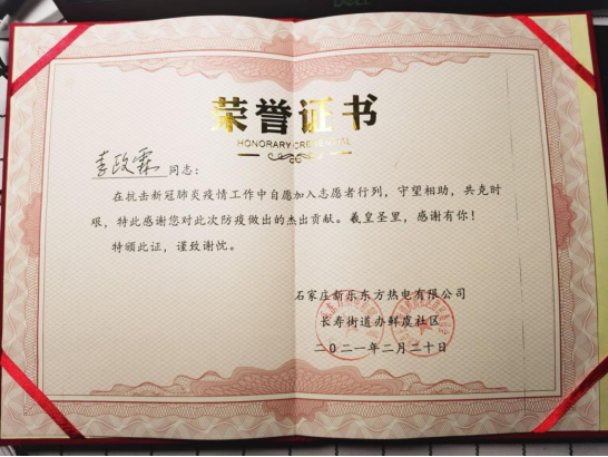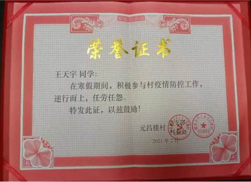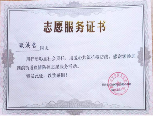 2021年是中国共产党成立100周年,是“十四五”规划开局之年。为引领广老员工深入学习贯彻习近平新时代中国特色社会主义思想和党的十九届五中全会精神,扎根中国大地了解国情民情,通过社会实践坚定理想信念、站稳人民立场、练就过硬本领、投身强国伟业。在本次组织开展的2021年寒假社会实践活动中,公司能动1801班杨溯倬、机类2003班王天宇、机类2004班周明朗、能动1902班吴文旭、机类2017班夏耀城、机类2005班李政霖、机类2007班顾洪哲、智造1801班赵泓铮、智造1801班郭明延、机械1902班邹佳华等10名同学积极投身到家乡疫情防控工作中去,将浓浓的爱国之情化作坚定的报国之行,用实际行动为打赢疫情防控阻击战贡献青春力量,荣获“优秀志愿者”称号。