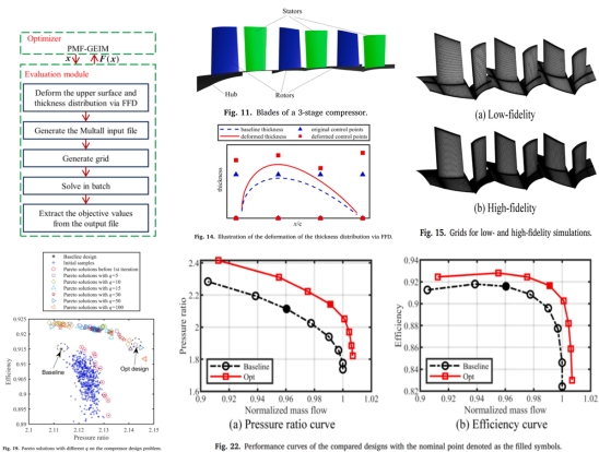 最后,将所提方法应用于144个变量的某3级轴流压气机的设计优化中。多级压气机作为航空发动机/重型燃气轮机的三大核心部件之一,其气动性能和气动稳定性对系统能耗水平和安全运行至关重要,其设计水平和性能关乎国家的核心竞争力和双碳目标的实现。设计优化是多级压气机增效扩稳的有效途径。将本研究所提的高效MFMOBO算法与压气机的自动CFD仿真分析结合,建立了某3级压气机的自动设计优化平台并开展应用。使用了870次CFD模拟,即对该压气机在设计点的压比和效率取得了显著改进。