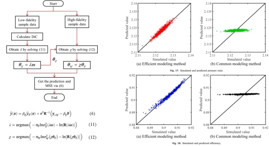 为此,研究人员首先提出了一种高效的多可信度分层Kriging建模方法,以破解近似模型的维度诅咒问题。在构建低可信度模型时,利用距离相关系数来计算超参数的相对值。然后,将确定超参数的最大似然估计问题转化为一维优化问题,从而能够显著提高建模效率。高可信度模型构建步骤类似,所不同的是将低可信度模型的超参数作为高可信度模型超参数的相对值。所提的高效建模方法能将建模时间降低到常规方法的1%,其仅用时16.71秒即可建立具有144个变量的3级压缩机性能预测的高精度模型。
