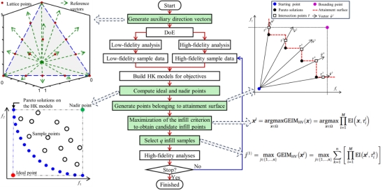 其次,为利用并行计算提升MFMOBO算法的寻优效率,提出了基于广义超体积改善期望矩阵(GEIM)的采样准则,并进一步发展了基于GEIM的并行多点采样准则以及并行MFMOBO算法。所提方法的特有之处是每次迭代的采样点数显著大于现有方法(可多达100个),以利用大规模并行计算提高优化效率。在使用小规模并行采样点个数的对比实验中,所提出的并行MFMOBO算法与现有方法相比具有很高的竞争力;在大规模并行采样点个数的数值实验中,所提方法展示了利用大规模并行计算大幅提升优化搜索速度的特性。
